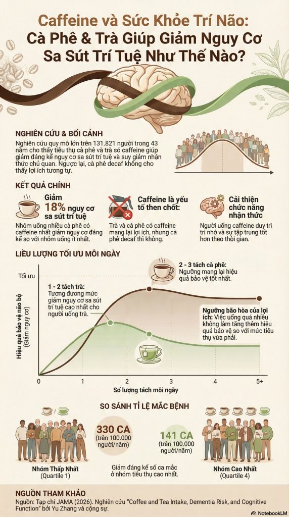 Bắt đầu ngày mới bằng một tách cà phê thơm nồng hay một ly trà ấm đã trở thành nghi thức không thể thiếu của hàng triệu người. Tuy nhiên, đằng sau sự tỉnh táo tức thì đó là một câu hỏi quan trọng về sức khỏe dài hạn: Liệu thói quen này đang bảo vệ hay làm tổn thương trí não của chúng ta? Một nghiên cứu quy mô đồ sộ vừa được công bố trên tạp chí y khoa danh tiếng JAMA, theo dõi sát sao 131.821 tình nguyện viên (bao gồm các nữ y tá từ nghiên cứu NHS và nam chuyên gia y tế từ nghiên cứu HPFS) trong suốt 43 năm, đã mang đến câu trả lời xác đáng về liều lượng “vàng” để duy trì sự minh mẫn cho não bộ.