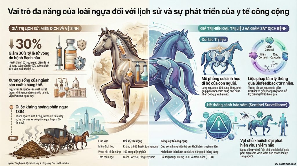Hành trình của loài ngựa trong lịch sử y tế là một sự chuyển dịch ngoạn mục: từ “nhà máy” sản xuất huyết thanh đến “đối tác” trị liệu và cuối cùng là “lính gác” bảo vệ sự tồn vong của cộng đồng. Tất cả đều hội tụ về một triết lý thượng tầng: One Health (Một Sức Khỏe). Sức khỏe của con người, động vật và hệ sinh thái là một thể thống nhất, không thể tách rời.