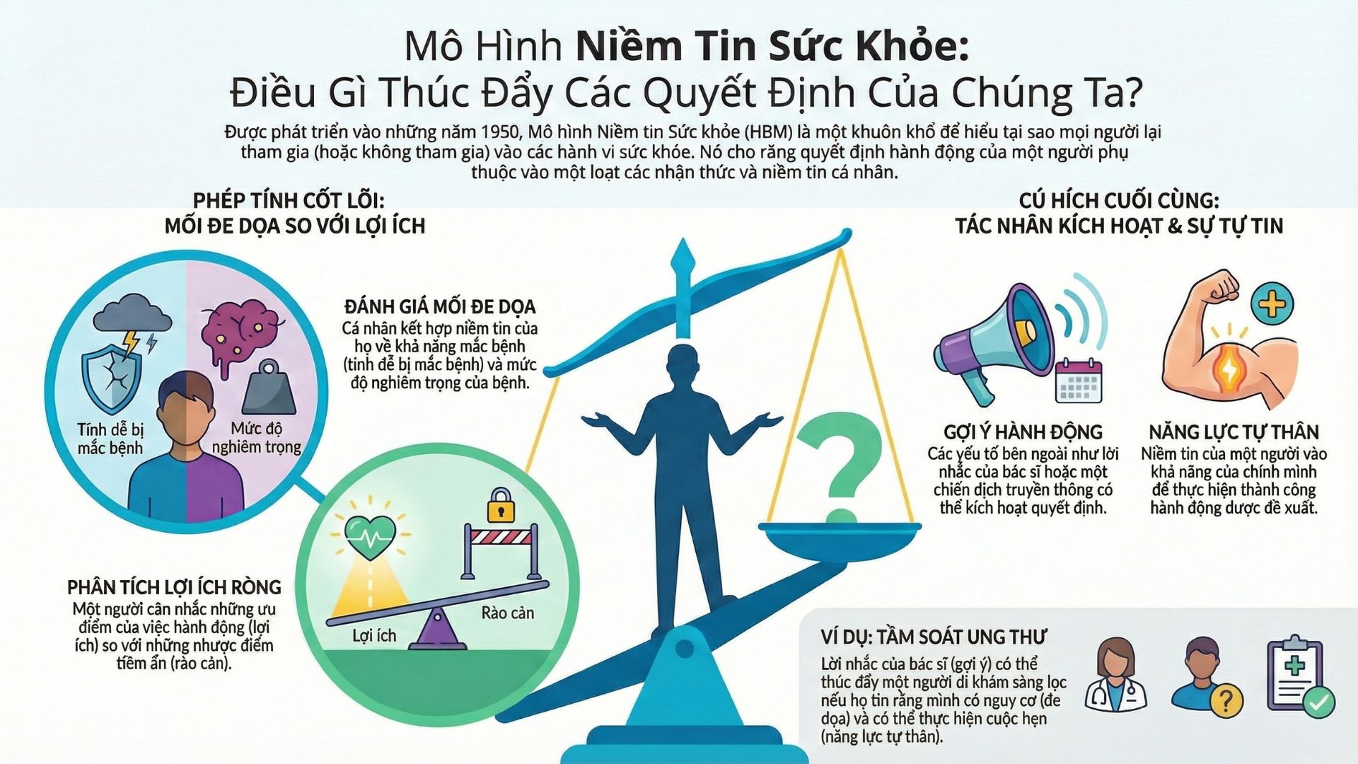 Để giải mã nghịch lý này, các nhà khoa học đã xây dựng nên Mô hình Niềm tin Sức khỏe (Health Belief Model – HBM). Đây không chỉ là một lý thuyết khô khan, mà còn là chiếc chìa khóa giúp chúng ta hiểu thấu những động lực thầm kín và những rào cản vô hình chi phối mọi quyết định chăm sóc bản thân của con người.